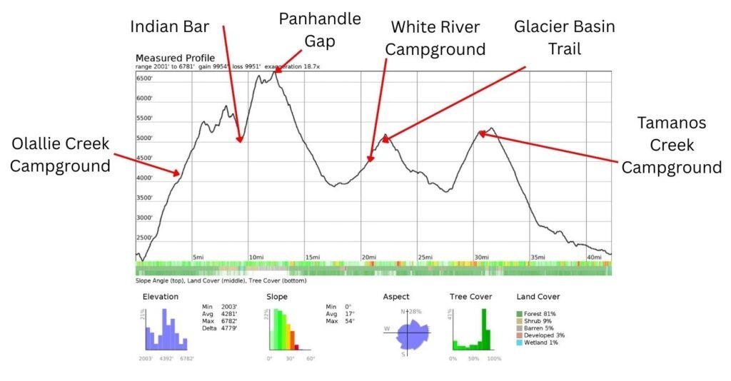 - Route: Stevens Canyon → Ollie Creek → Indian Bar → Panhandle Gap → Summerland → White River → Emmons Glacier Lookout→ Tamanos Creek → East Side Trail → Stevens Canyon
