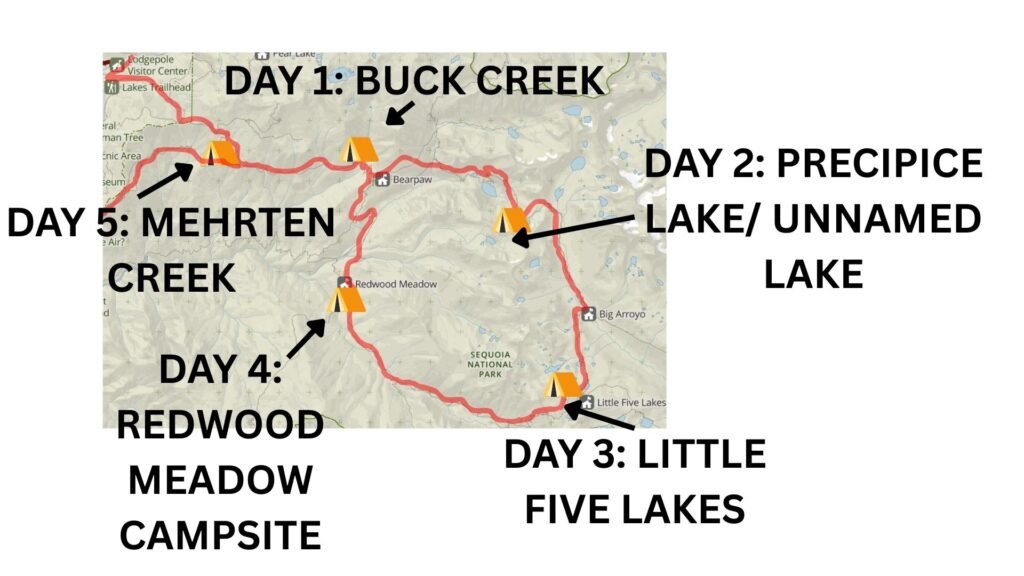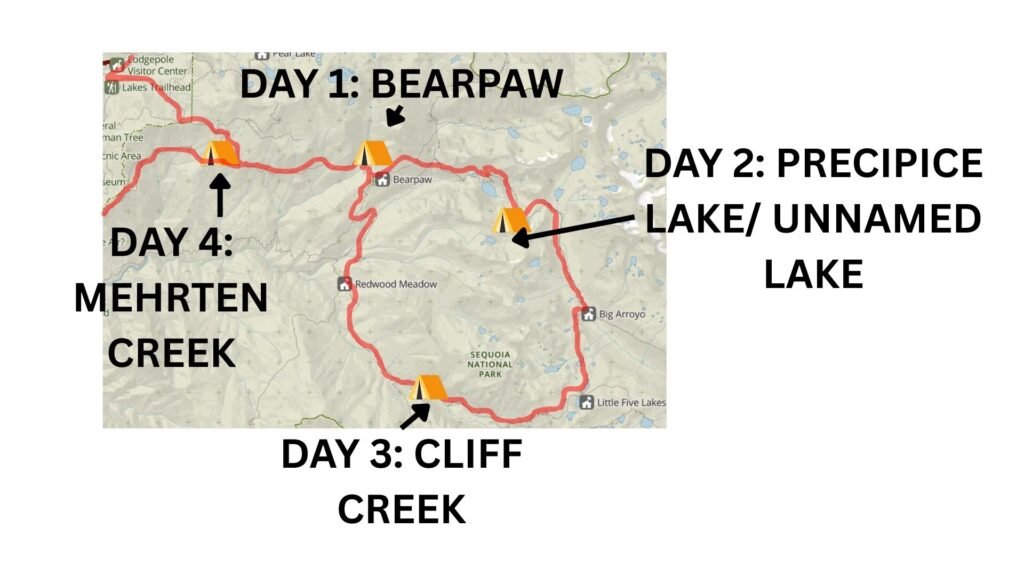 The map below gives a high‑level overview of the entire Hamilton Basin Loop. More detailed maps are included throughout my trip‑report series — Backpack the High Sierra Trail Now — where each day has its own annotated route and key waypoints.