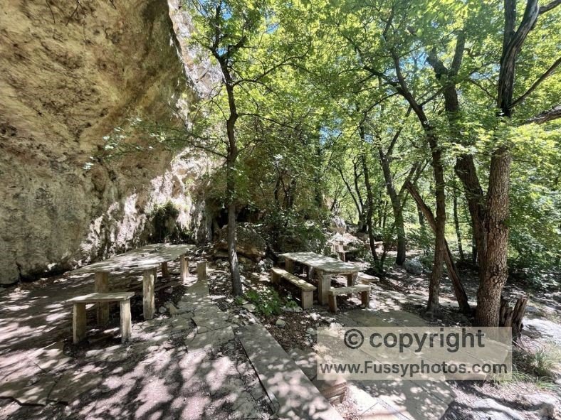 Shaded picnic benches with The Grotto visible in the alcove behind.